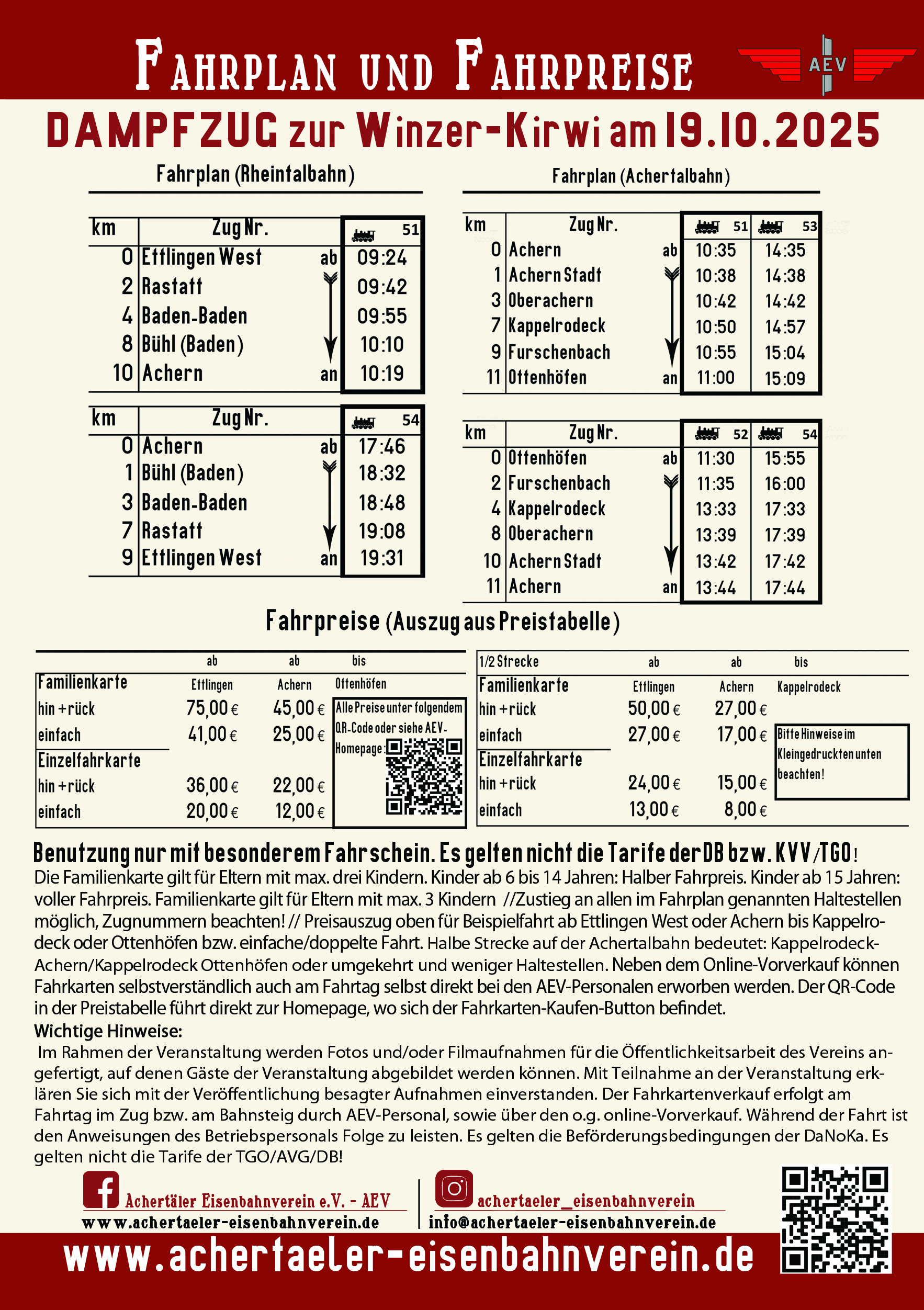 Fahrgäste können ihren Fahrschein am Fahrtag selbst bei unseren AEV-Personalen am Bahnsteig oder im Zug erwerben. Der Vorverkauf versteht sich als Zusatzangebot und schließt den Verkauf von Fahrkarten am Fahrtag selbst nicht aus!
